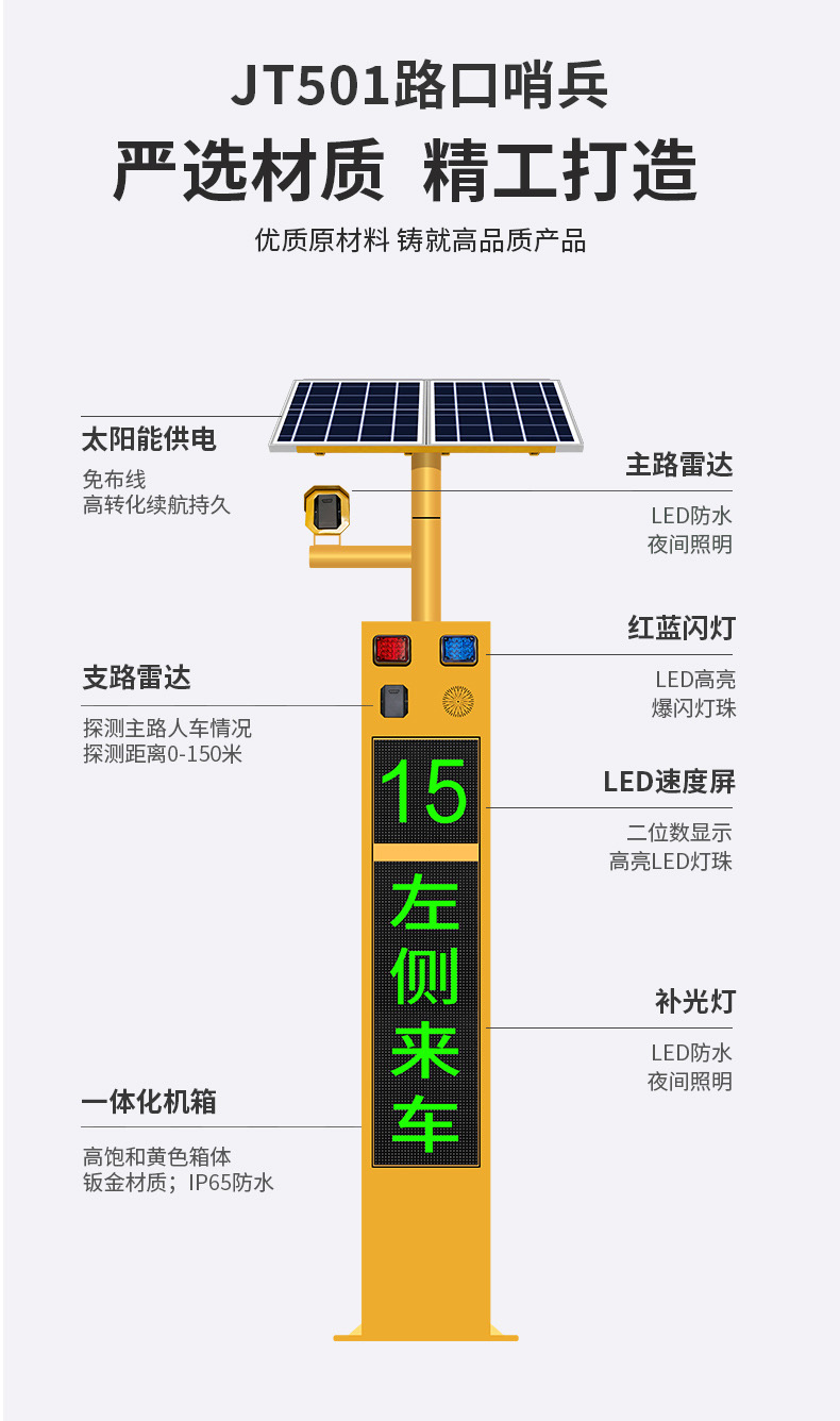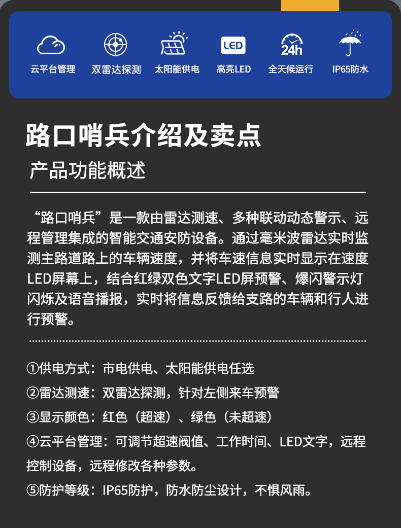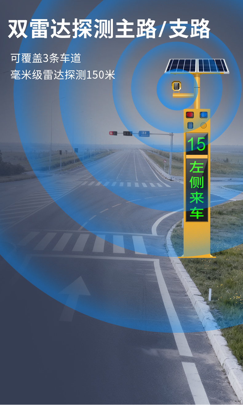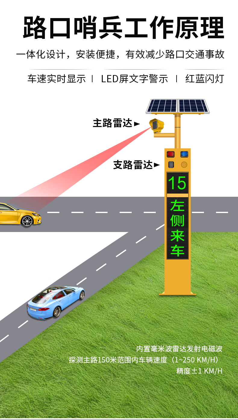 "路口哨兵”是一款由雷达测速、多种联动动态警示、远程管理集成的智能交通安防设备。通过毫米波雷达实时监测主路道路上的车辆速度,并将车速信息实时显示在速度LED屏幕上,结合红绿双色文字LED屏预警、爆闪警示灯闪烁及语音播报,实时将信息反馈给支路的车辆和行人进行预警。