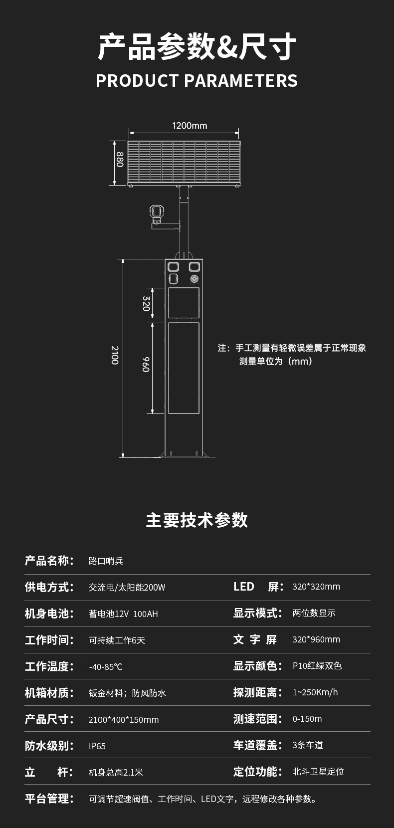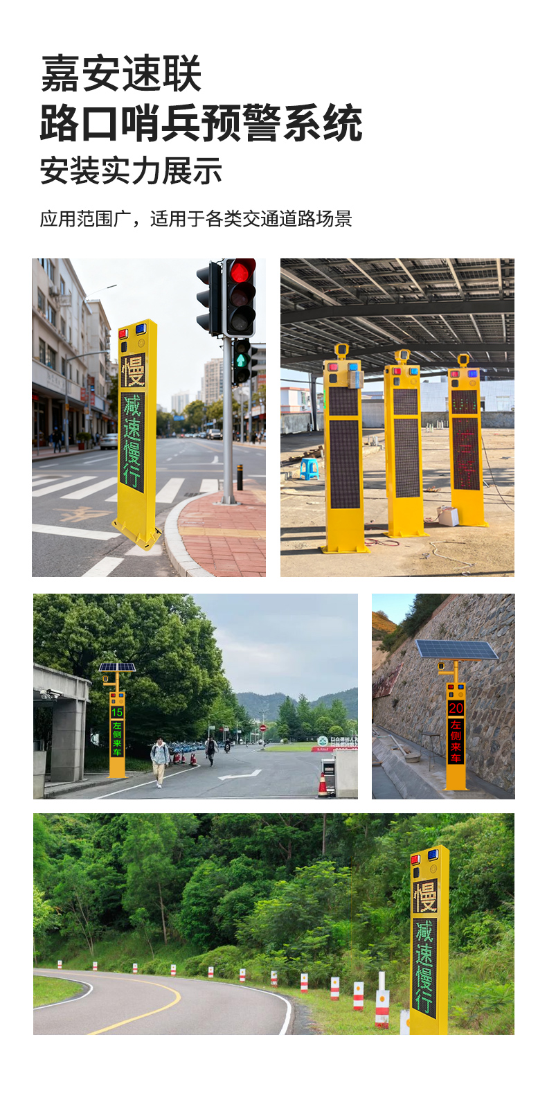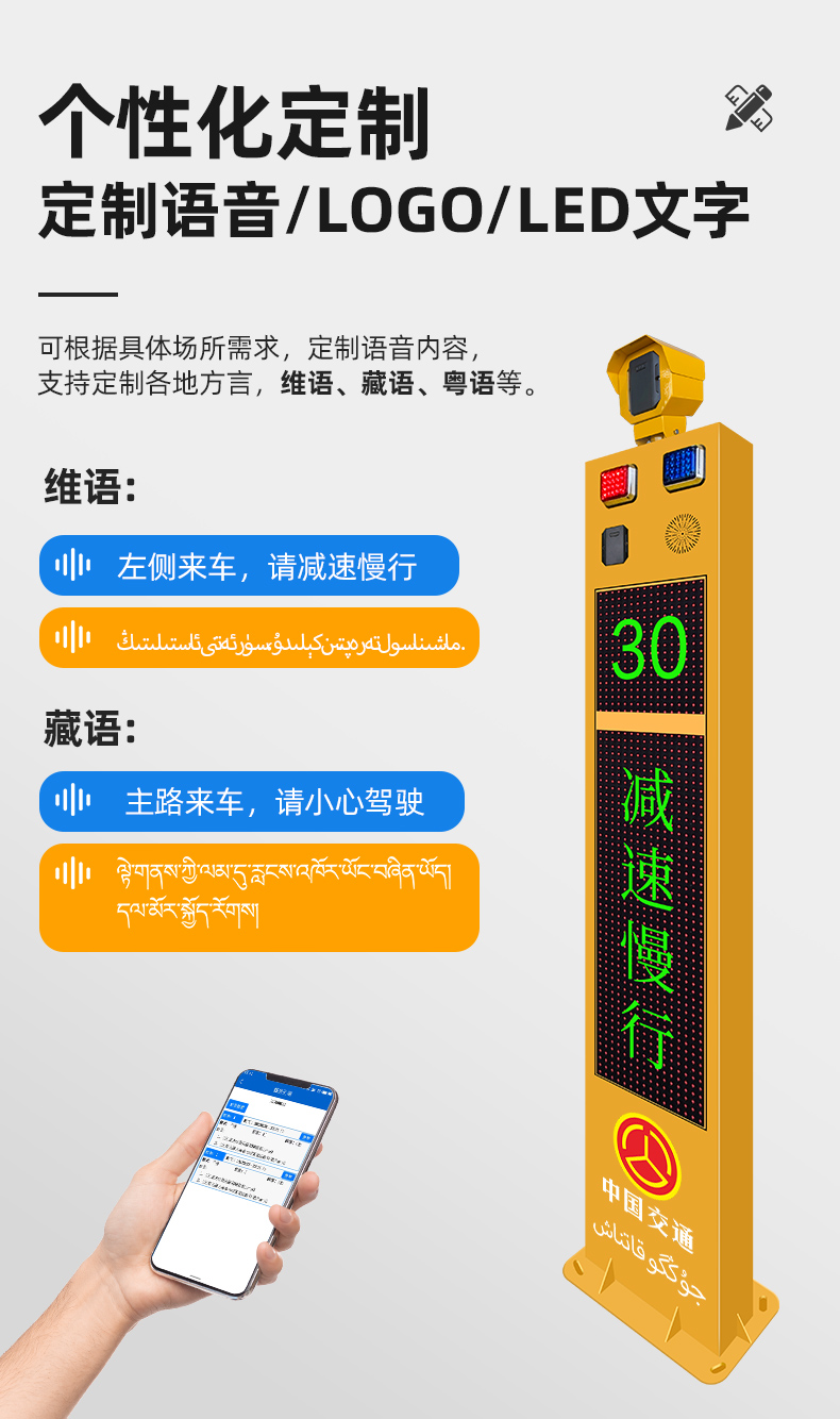 "路口哨兵”是一款由雷达测速、多种联动动态警示、远程管理集成的智能交通安防设备。通过毫米波雷达实时监测主路道路上的车辆速度,并将车速信息实时显示在速度LED屏幕上,结合红绿双色文字LED屏预警、爆闪警示灯闪烁及语音播报,实时将信息反馈给支路的车辆和行人进行预警。