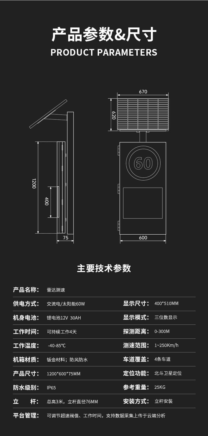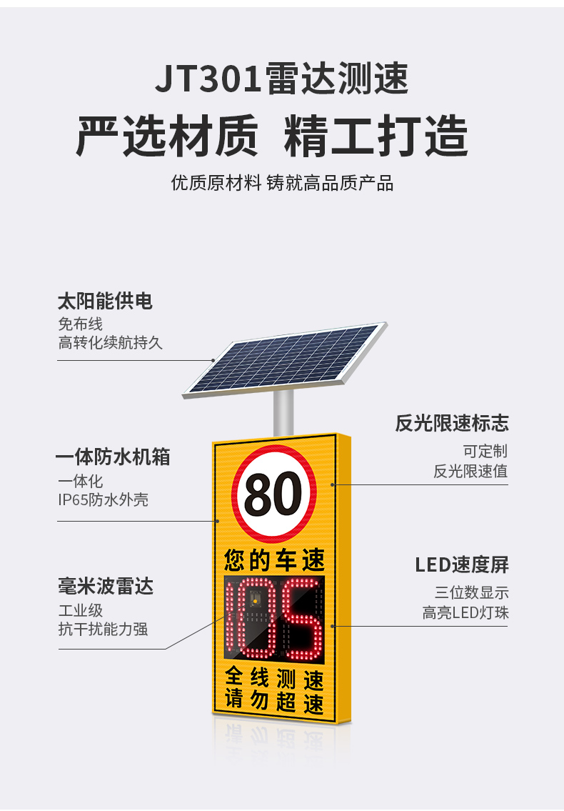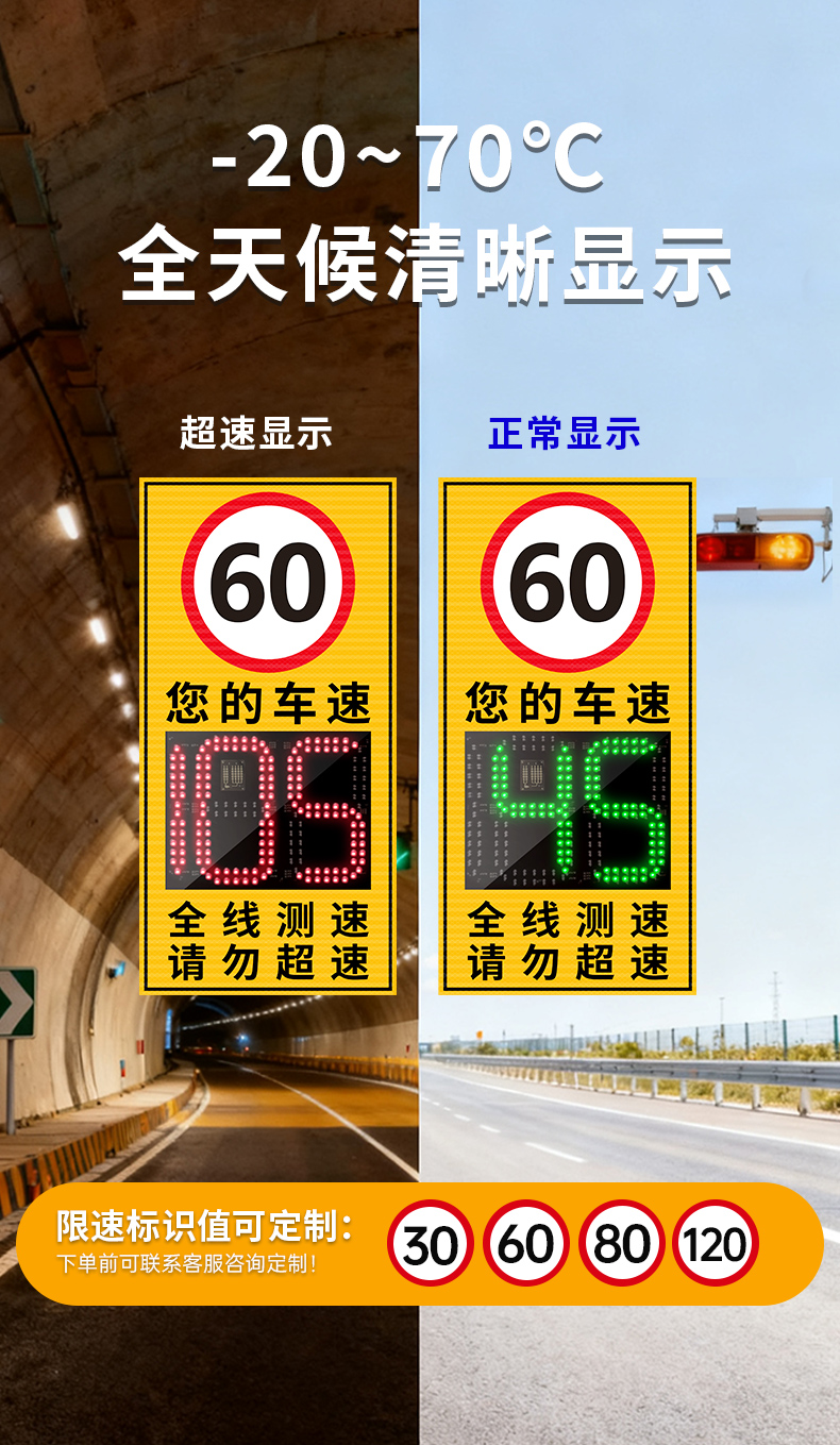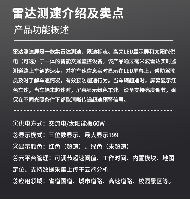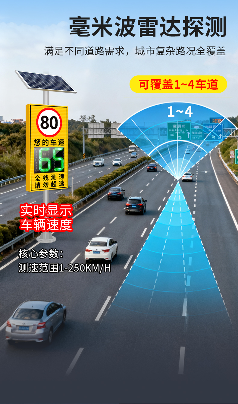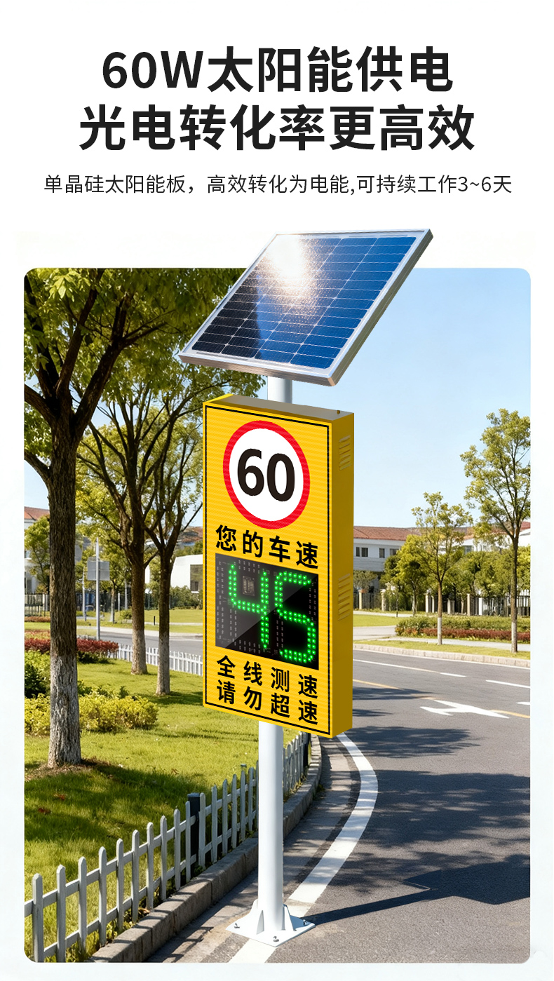 雷达测速屏是一款集雷达测速、限速标志、高亮LED显示屏和太阳能供电(可选)于一体的智能交通监控设备。该产品通过毫米波雷达实时监测道路上车辆的速度,并将车速信息实时显示在LED屏幕上,帮助驾驶员及时了解车速情况,有效预防超速行为。当车辆超速时,屏幕显示红色车速;当车辆未超速时,屏幕显示绿色车速。设备支持亮度调节,确保在不同光照条件下都能清晰传递超速预警信号。