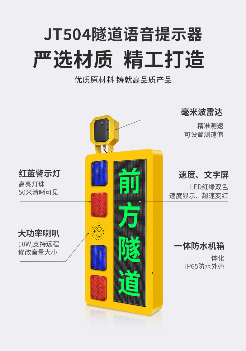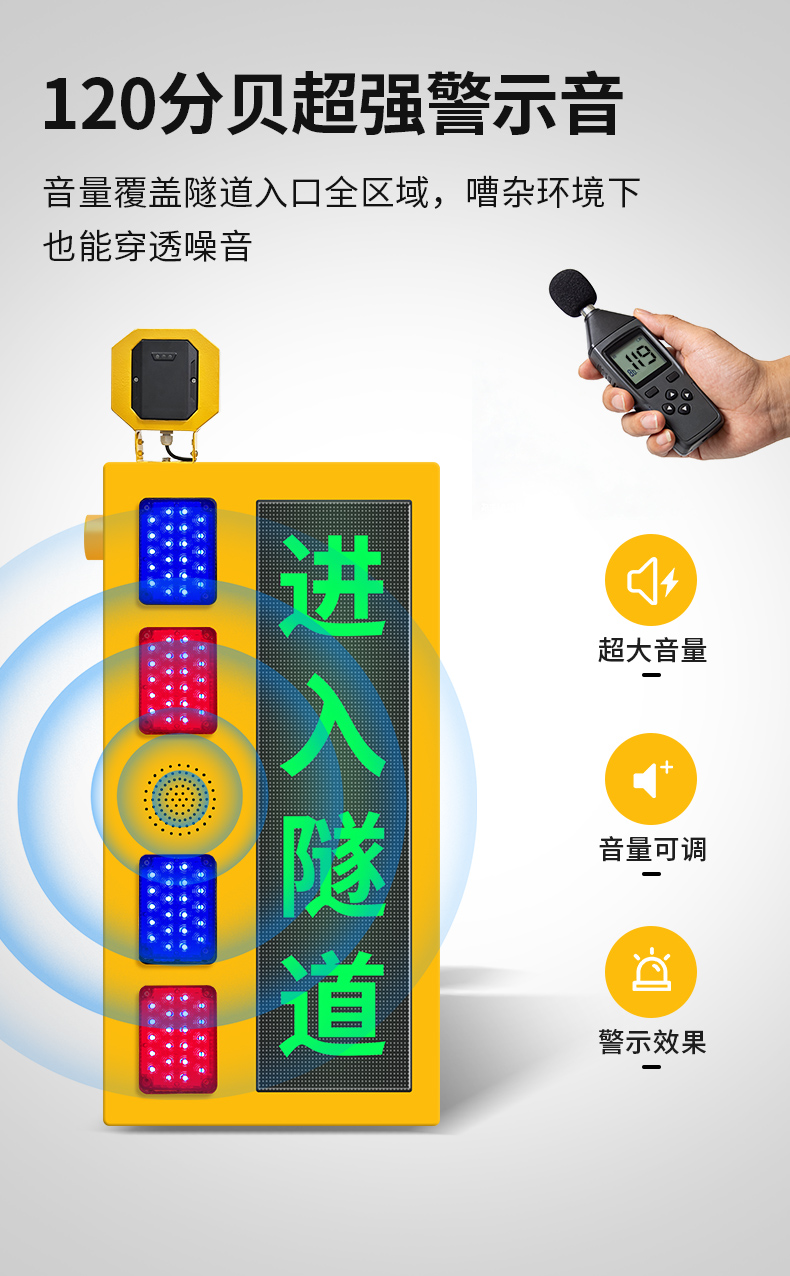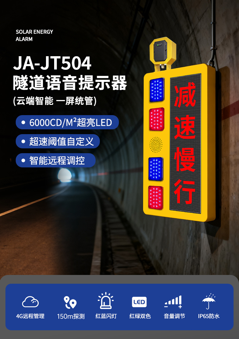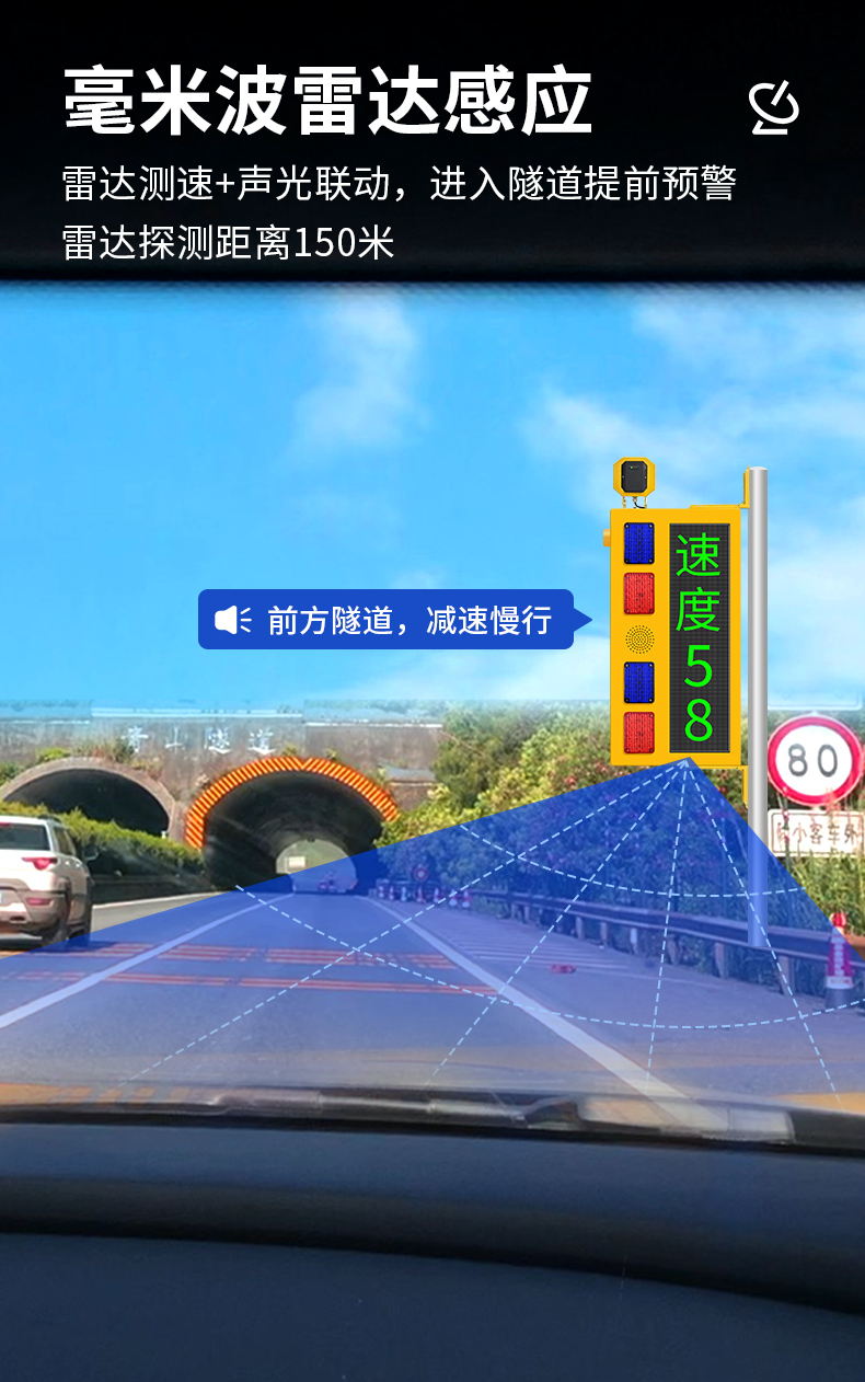 隧道语音提示器是一款集雷达测速、高亮LED显示屏和高亮红蓝警示灯于一体的智能隧道预警设备。该产品通过毫米波雷达实时监测隧道口道路上过往的车辆情况,结合红绿双色文字LED屏预警、爆闪警示灯闪烁及语音播报,实时将信息反馈给进隧道的过往车辆进行预警。帮助进隧道的过往车辆及时了解前方隧道的情况。设备支持亮度调节,确保在不同光照条件下都能清晰传递预警信号。