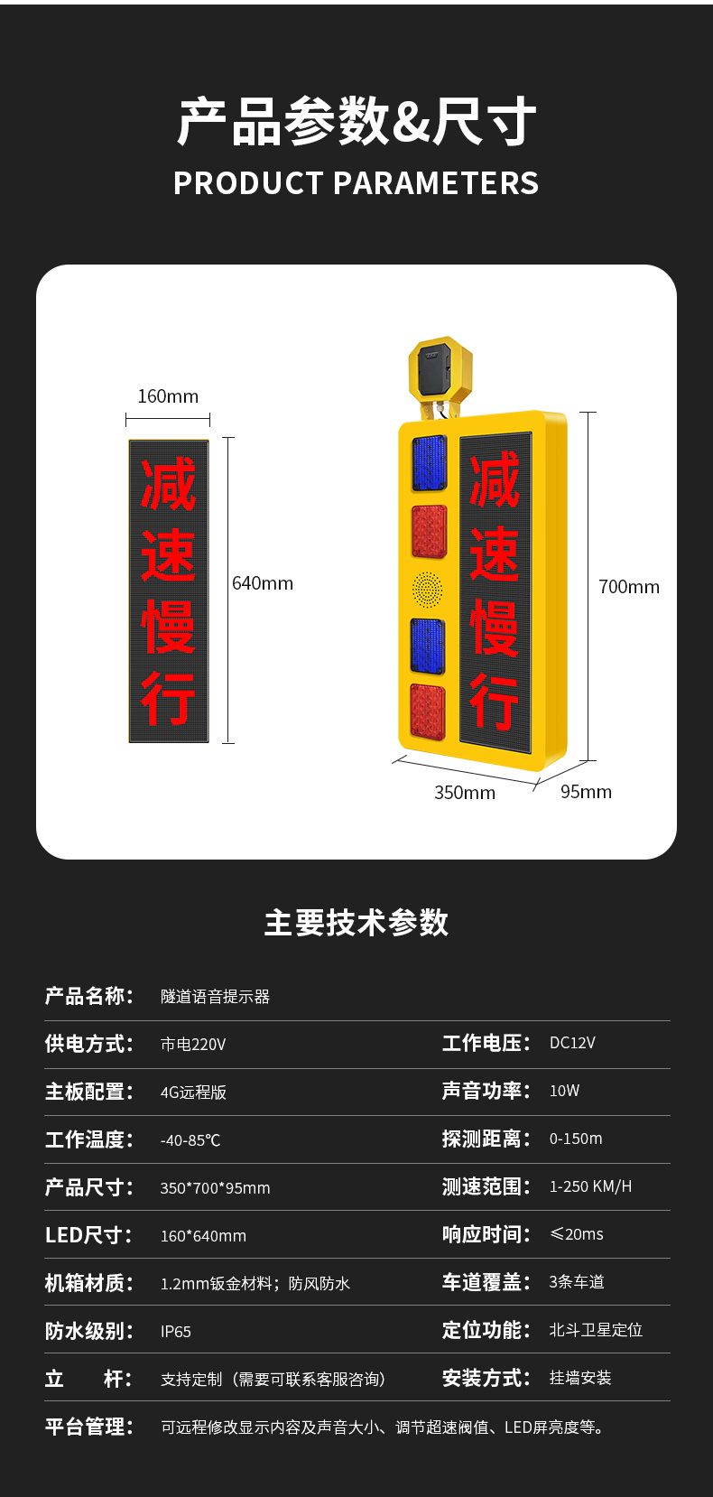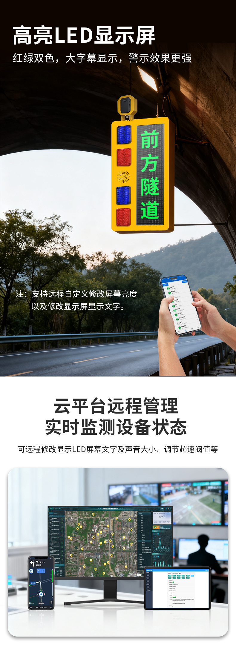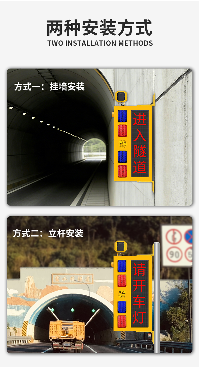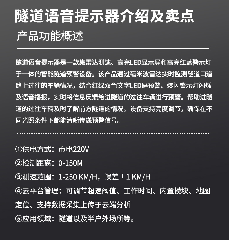 隧道语音提示器是一款集雷达测速、高亮LED显示屏和高亮红蓝警示灯于一体的智能隧道预警设备。该产品通过毫米波雷达实时监测隧道口道路上过往的车辆情况,结合红绿双色文字LED屏预警、爆闪警示灯闪烁及语音播报,实时将信息反馈给进隧道的过往车辆进行预警。帮助进隧道的过往车辆及时了解前方隧道的情况。设备支持亮度调节,确保在不同光照条件下都能清晰传递预警信号。